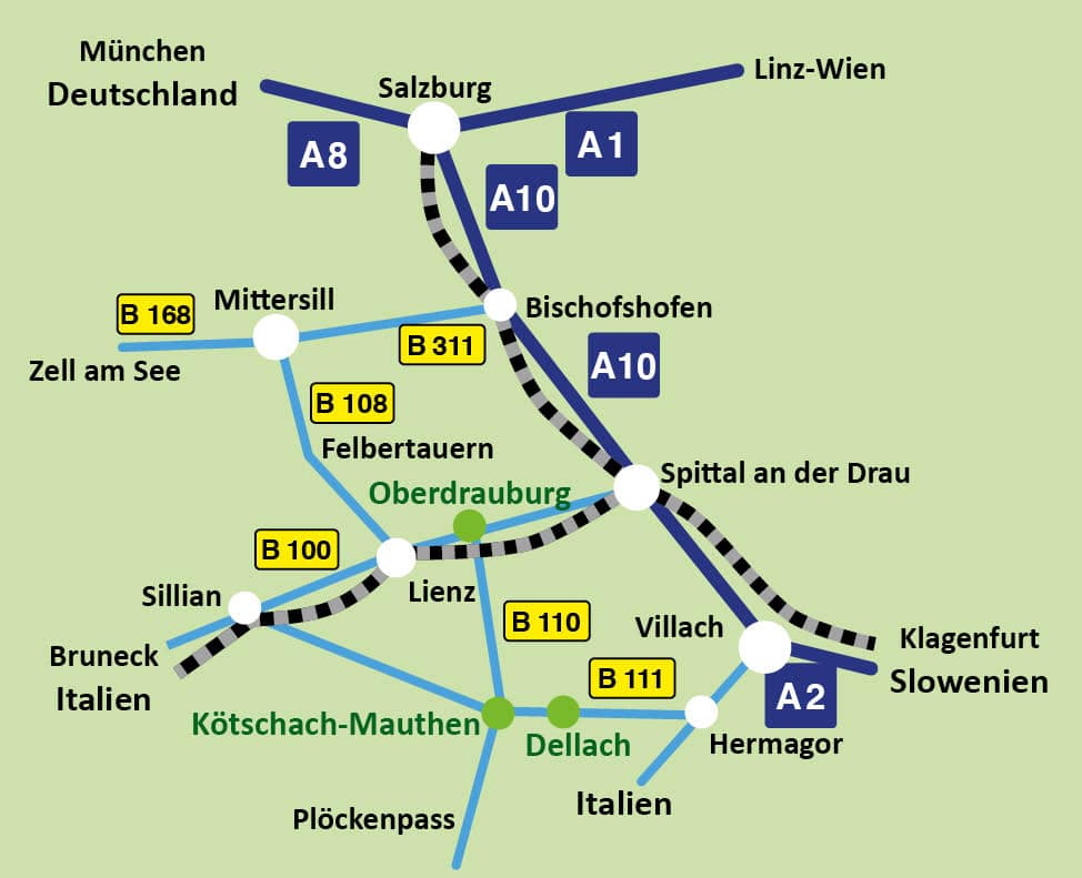 Route vom Norden: Von Salzburg mit der Bahn nach Spittal/Millstätter See und weiter bis Oberdrauburg. Von dort weiter mit dem Mobilbüro-Bus.