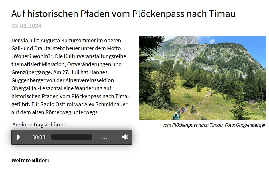ORF „Kärnten heute“ am 31.7.2024, gestaltet von Horst Ebner: AusGewandert (Wolfgang Puschnig, Jon Sass), BRIX TRIX und die Gurina, BABA YAGA in der Ruine Hohenburg in Oberdrauburg)Radio Osttirol, Interview mit Wolfgang Waldner zu Thema Migration (Bild anklicken und scrollen unter „Ähnliche Beiträge“)Radio Osttirol: Auf historischen Pfaden vom Plöckenpass nach Timau